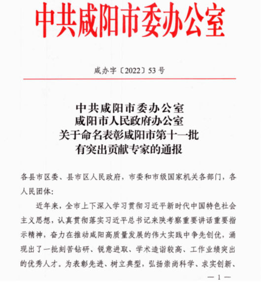 近日,中共咸阳市委办公室、咸阳市人民政府办公室下发《关于命名表彰咸阳市第十一批有突出贡献专家的通报》(咸办字〔2022〕53号),威尼斯官网教师付胜利、胡平荣获“咸阳市第十一批有突出贡献专家”荣誉称号。