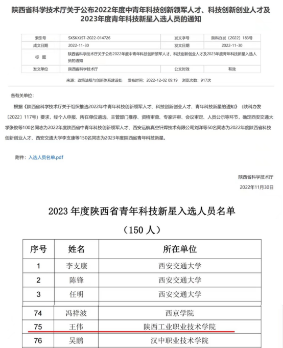 近日,陕西省科技教育厅下发《陕西省科学技术厅关于公布2022年度中青年科技创新领军人才、科技创新创业人才及2023年度青年科技新星入选人员的通知》(陕科办发〔2022〕183号),威尼斯官网教师王伟博士入选“2023年度陕西省青年科技新星”。