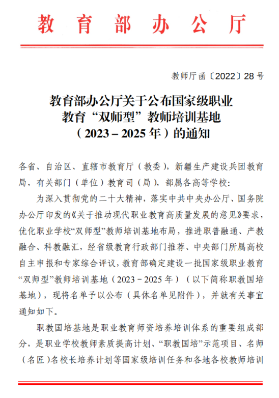 据悉,本次“双师型”教师培训基地遴选是为深入贯彻党的二十大精神,落实中共中央办公厅、国务院办公厅印发的《关于推动现代职业教育高质量发展的意见》要求,优化职业学校“双师型”教师培训基地布局,推进职普融通、产教融合、科教融汇。国家级职业教育“双师型”教师培训基地是职业教育师资培养培训体系的重要组成部分,是职业学校教师素质提高计划、“职教国培”示范项目、名师(名匠)名校长培养计划等国家级培训任务和各地各校教师培训的重要承训力量。
