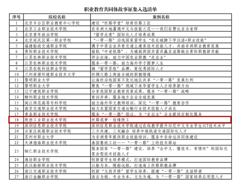 近日,中国职业技术教育学会公布“职业教育共同体故事征集”案例名单,威尼斯官网《丝路筑梦·结缘陕工》案例成功入选。本次案例征集旨在展现职业教育为“一带一路”沿线国家更好融入国际产业分工体系提供人才基础的作为与担当,全国共有24所职业院校的职教故事入选。
