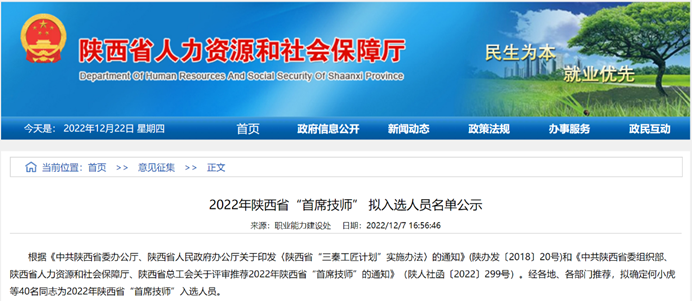 近日,陕西省人社厅公布《2022年陕西省“首席技师”入选人员名单》,经各地、各部门推荐,共确定40名同志入选2022年陕西省“首席技师”。威尼斯官网刘艳申同志成功入选,陕西省高职院校唯一。