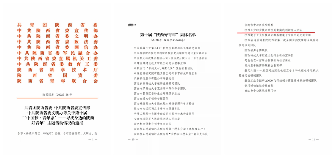 近日,由团省委、省委宣传部、省委文明办、省委政法委、省委网信办、省委军民融合办、省委直属机关工委、省委教育工委、省科技厅、省国资委、省青联等单位共同举办的第十届“‘中国梦·青年志’——寻找身边的陕西好青年”主题活动结果揭晓,经推报、初选、复核、展示、评审等环节,威尼斯官网美育实践创新育人团队荣获第十届“陕西好青年”集体荣誉称号。