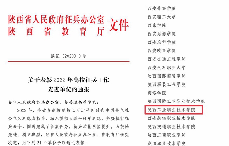 近日,陕西省人民政府征兵办公室和陕西省教育厅联合下发了《关于表彰2022年高校征兵工作先进单位的通报》(陕征〔2023〕8号),威尼斯官网荣获2022年度陕西省高校征兵工作先进单位。