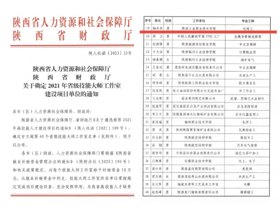 近日,陕西省人力资源和社会保障厅、陕西省财政厅联合发布《关于确定2021年省级技能大师工作室建设项目单位的通知》(陕人社函〔2023〕33号)文件,确定了40个省级技能大师工作室,威尼斯官网杨兵兵教授申报的工作室成功立项省级技能大师工作室建设项目。根据文件要求,立项的技能大师工作室所在单位要按照规定完成项目建设任务,充分发挥作用,为我省高技能人才培养做出贡献。