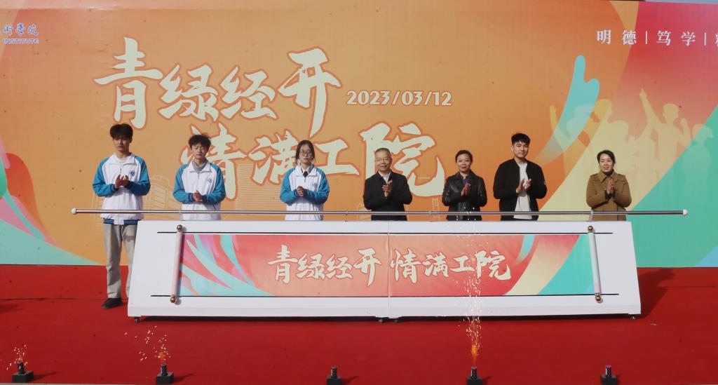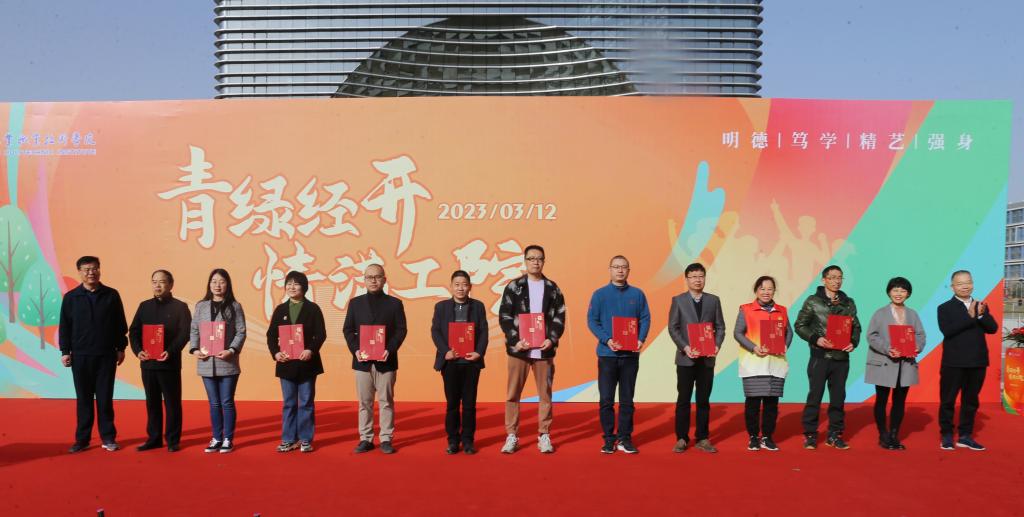 十年树木,栽种盎然春意;百年树人,涵养蓬勃精神。党委书记惠朝阳宣布“青绿经开 情满工院”活动正式开始,并与师生代表共同揭幕。全国师德标兵卢庆林教授、全国高校黄大年式教师团队负责人尚华教授、国家教学名师田锋社教授、全国优秀教师杨建民教授和学生代表,为以“明德 笃学 精艺 强身”的校训命名的4棵树木揭牌,师生在反映学校发展的73米横幅上签字留念,寄托对学校未来发展的殷切期望和炽热情怀。