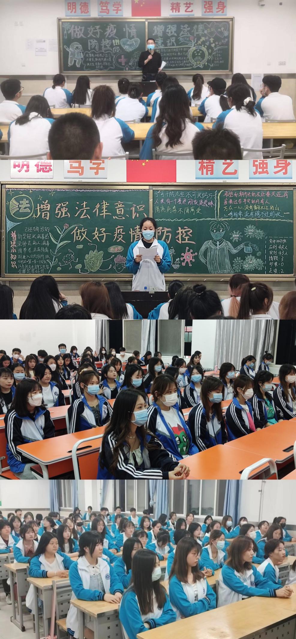 为了加强疫情防控法治教育宣传,增强学生疫情防控法制观念,让学生在特殊时期养成学法、懂法、守法的好习惯。财经学院4月10日晚自习时间,在2020级、2021级各班级召开“增强法律意识,做好疫情防控”主题班会,本次班会由各班班主任主持。