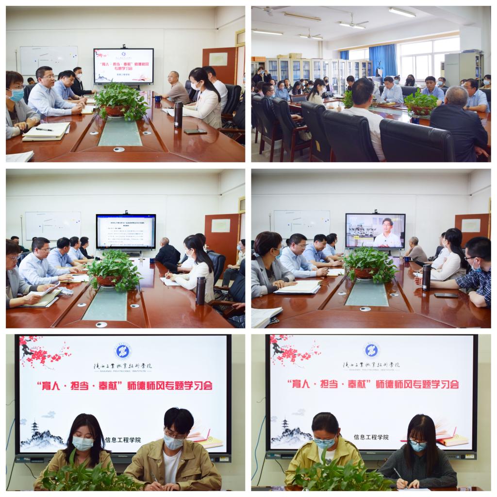 为进一步加强教师队伍师德师风和纪律作风建设,增强教职工立德树人奋进担当的时代精神,4月25日,信息学院党总支在崇文主楼806召开“育人·担当·奉献”师德师风专题学习会,全体教师参加会议。会议由党总支书记闫军主持。