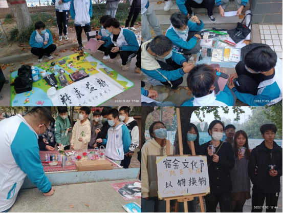 “跳蚤市场以物换物”活动于11月2日-3日每日下午4点半在明善园篮球场旁开展。活动前期,各班班干部首先组织同学们以宿舍为单位进行一次“断舍离”,将自己闲置且依然有价值的物品整理出来,作为“跳蚤市场”以物换物储备物品。活动现场,以宿舍为单位的各展位上都摆放着琳琅满目的闲置待交换物品,舍友间合作配合“经营”,前来参与的同学满载而归,其乐融融,成为当日校园里一道亮丽的风景。通过本次活动,同学们不仅整理了宿舍的环境卫生,学会了“断舍离”的精神,还极大地提高的物品利用率,也促进了舍友之间的感情,助力和谐宿舍建设。
