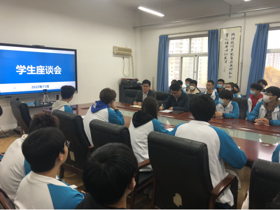 座谈会上,各班学生代表畅所欲言,围绕疫情请假、课程学习、宿舍问题、晚自习考勤、教师授课方式、第二课堂学分、应征入伍等方面提出意见和建议,参会老师们认真聆听,就相关问题对学生作了回应和解答,并表示对于学生反应的问题尽快进行梳理、落实和反馈,确保同学们的学习与生活得到保障。党总支书记郝平作总结发言,他对同学们精心收集各类诉求以及意见建议表示肯定,并指出学校一直在努力为同学们的成长成才提供最优的平台和环境,凡是影响到同学们学习的问题,学校一定高度重视并及时回应,满足绝大部分同学合理的诉求。希望全体同学充分利用好大学三年,勤奋学习,完善人格,提升综合素质,做一名德智体美劳全面发展的大学生。