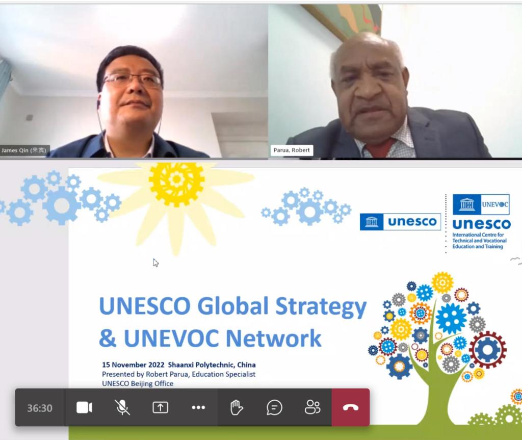11月15日,国际教育学院与联合国教科文组织驻华代表处举行视频会议,交流研讨合作项目。教科文组织驻华代表处教育项目专家裴伯庸(Robert Parua)博士,项目助理Zhao Tianzhou女士,国际教育学院院长秦景俊及部门工作人员参加了本次会议。