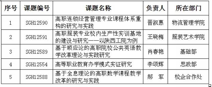 近日,陕西省教育科学规划领导小组办公室下发了《关于下达陕西省教育科学“十二五”规划2012年立项课题名单的通知》(陕教科规办【2012】10号)。根据通知,陕西省教育科学“十二五”规划2012年共立项课题661项,其中我院申报的5项教育教学研究类课题获准立项(详见下表)。