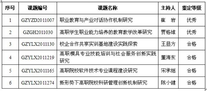 近日,接中国高等职业技术教育研究会通知,我院6项研究课题顺利通过结题验收。其中,崔岩教授主持的《职业教育与产业对话协作机制研究》和贾格维教授主持的《高职学生职业能力培养的教育教学改革研究》,经审核准予结题,鉴定等级为优秀;由王显方副教授等4位教师主持的4项课题经审核准予结题,鉴定等级为合格。结题通过情况详见下表: