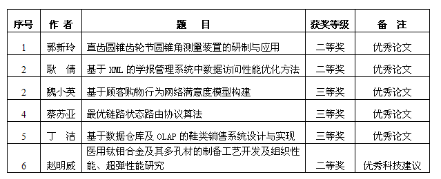 近日,根据咸阳市人民政府办公室《关于表彰咸阳市第七届自然科学优秀学术论文暨优秀科技建议奖的通报》(咸政办函[2015]133号文件),我院申报的8篇自然科学论文,有5篇分获咸阳市第七届自然科学优秀论文二等奖和三等奖。其中郭新玲、耿倩老师申报的论文分获二等奖,魏小英、蔡苏亚、丁洁3位教师撰写的论文分获三等奖。由赵明威老师完成的“医用钛钼合金及其多孔材的制备工艺开发及组织性能、超弹性能研究”荣获优秀科技建议二等奖。同时,我院被授予“优秀组织单位”。详见下表:
