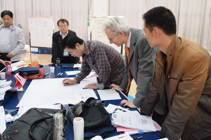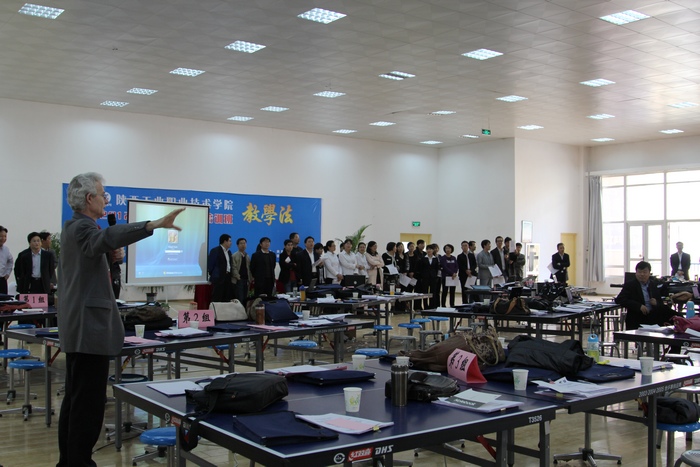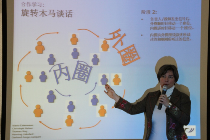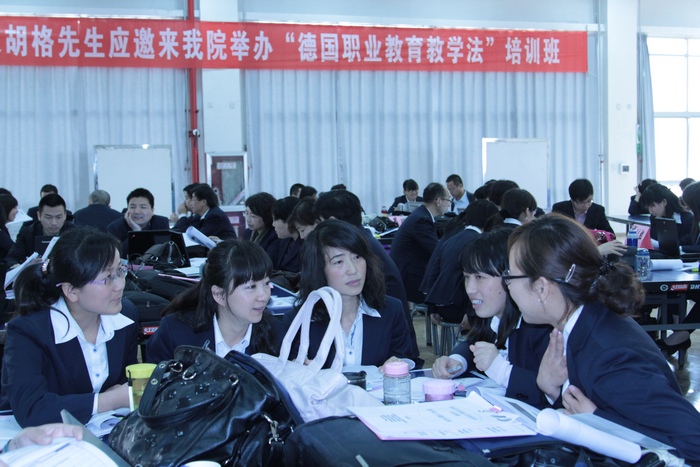 几天来,培训主讲德国教育专家胡格(Hug)教授围绕职业能力、职业教育、教与学、合作学习与行动导向学习、基于学习领域的学习、能力训练,共11个教学任务进行了深入浅出的讲解和示范。他形象清晰地向学员展示了实用、有趣的关键字卡片法、理解标注文字法、小组扩展法、可视化法、伙伴拼图法、旋转木马谈话法、逻辑关系法、站位法、工作与小组过程提炼法等十几种教学方法,并就如何运用这些方法在工作任务导向下培养学生的职业行为能力进行了生动的示范。