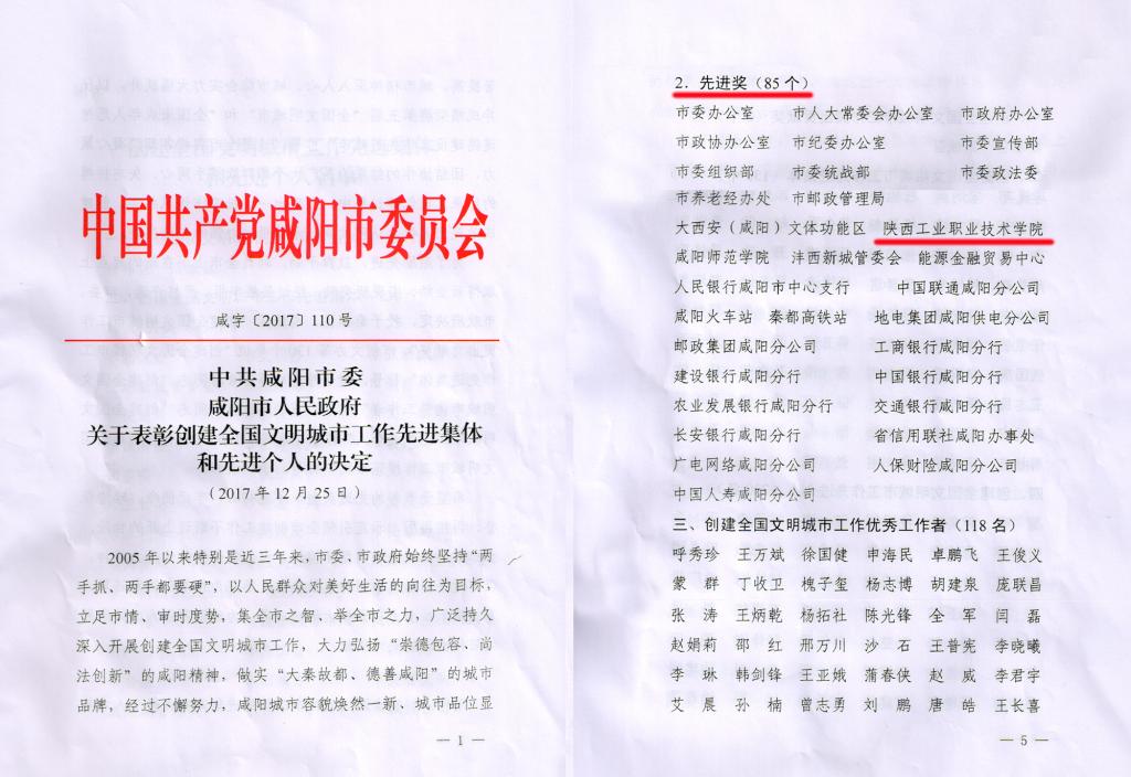 日前,中共咸阳市委、市政府对创建全国文明城市工作的先进集体和个人进行表彰,我院荣获“创建全国文明城市工作先进奖”称号。