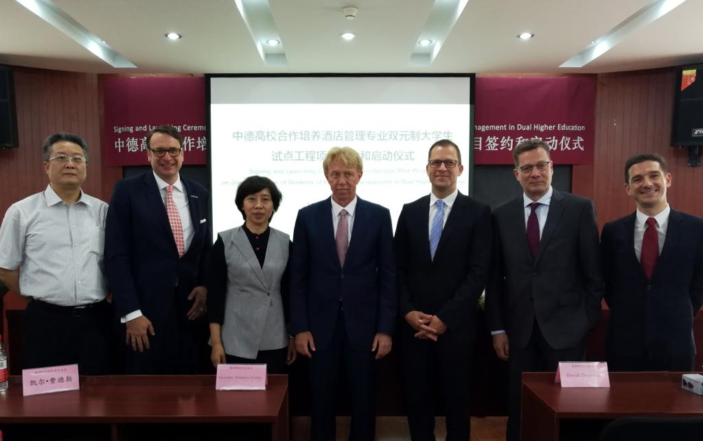 5月15日,“中德高校合作培养酒店管理专业双元制大学生试点工程”项目签约暨启动仪式在北京举行,来自中德两国的近20所高校领导、行业协会代表参加了仪式。我院院长张晓云与德国IST管理应用技术大学校长汉斯•乌尔里奇、德国酒店行业协会主席亚历山大•艾森布雷共同签署了《中德高校校际合作与双元制教育项目合作框架协议书》,标志着我院与德国双元制学生培养及教师交流项目合作正式启动。