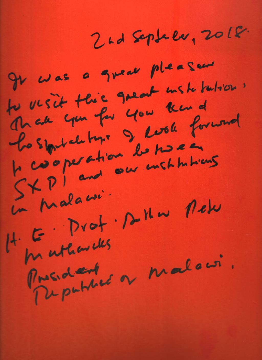 阿瑟·彼得·穆塔里卡总统表示非常高兴到访陕西工院。他指出,中国是马拉维的重要合作伙伴,希望能与学院在技能人才培养方面进行合作,共同培养优秀人才。最后,总统阁下还欣然题词:“参观这所优秀的学院是一件非常愉快的事情。感谢你们的盛情款待。我期待威尼斯7798cc与我们马拉维学校的合作。”