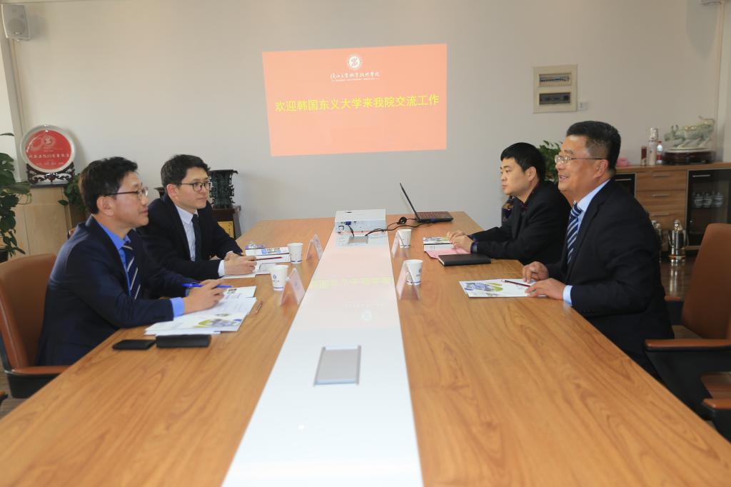 12月16日,韩国东义大学对外协力处处长李鸿培、国际交流部主任苏映民访问我院,党委副书记田昊接待了来宾。