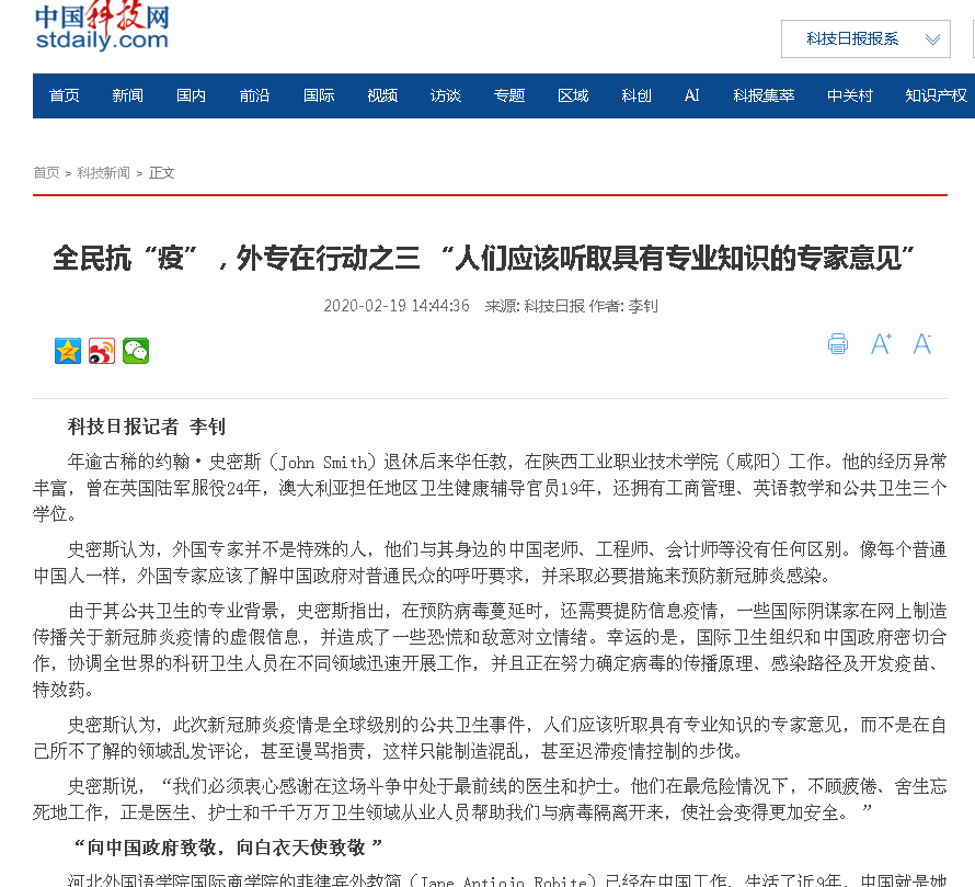 斯密斯认为,外国专家并不是特殊的人,他们与其身边的中国老师、工程师、会计师等没有任何区别。像每个普通中国人一样,外国专家应该了解中国政府对普通民众的呼吁要求,并采取必要措施来预防新冠肺炎感染。