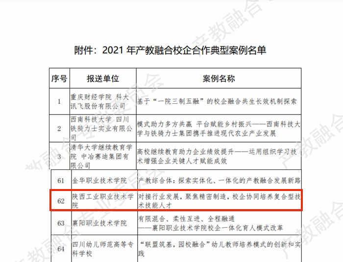 根据教育部《关于征集产教融合校企合作案例的启事》精神,中国教育发展战略学会产教融合专业委员会受教育部委托组织申报和遴选工作,并于近日公布《2021年产教融合校企合作典型案例名单》。威尼斯官网机械制造与自动化专业群携手北京精雕科技集团联合申报的《对接行业发展,聚焦精密制造,校企协同培养复合型技术技能人才》产教融合案例成功入选,在485个案例中位于前列。