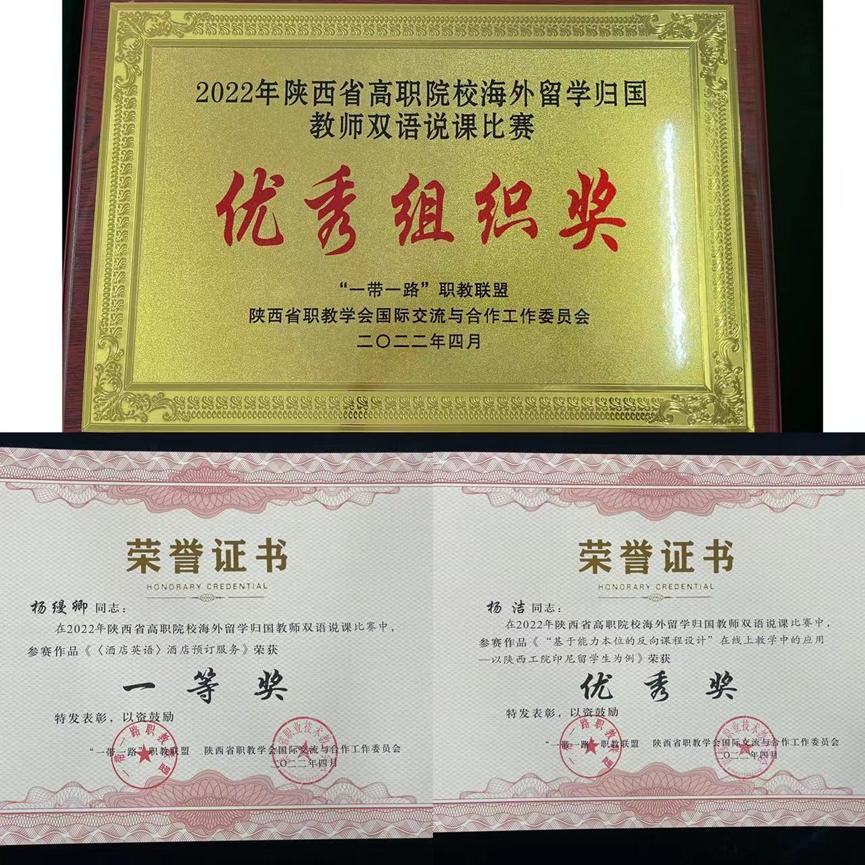 由“一带一路”职教联盟和陕西省职业技术教育学会主办的首届陕西省高职院校海外留学归国教师说课比赛于近期举行。经过视频初审、现场展示等环节,威尼斯官网财经与旅游学院“双语”教师杨缦卿斩获一等奖,杨洁获优秀奖,威尼斯官网获得优秀组织奖。