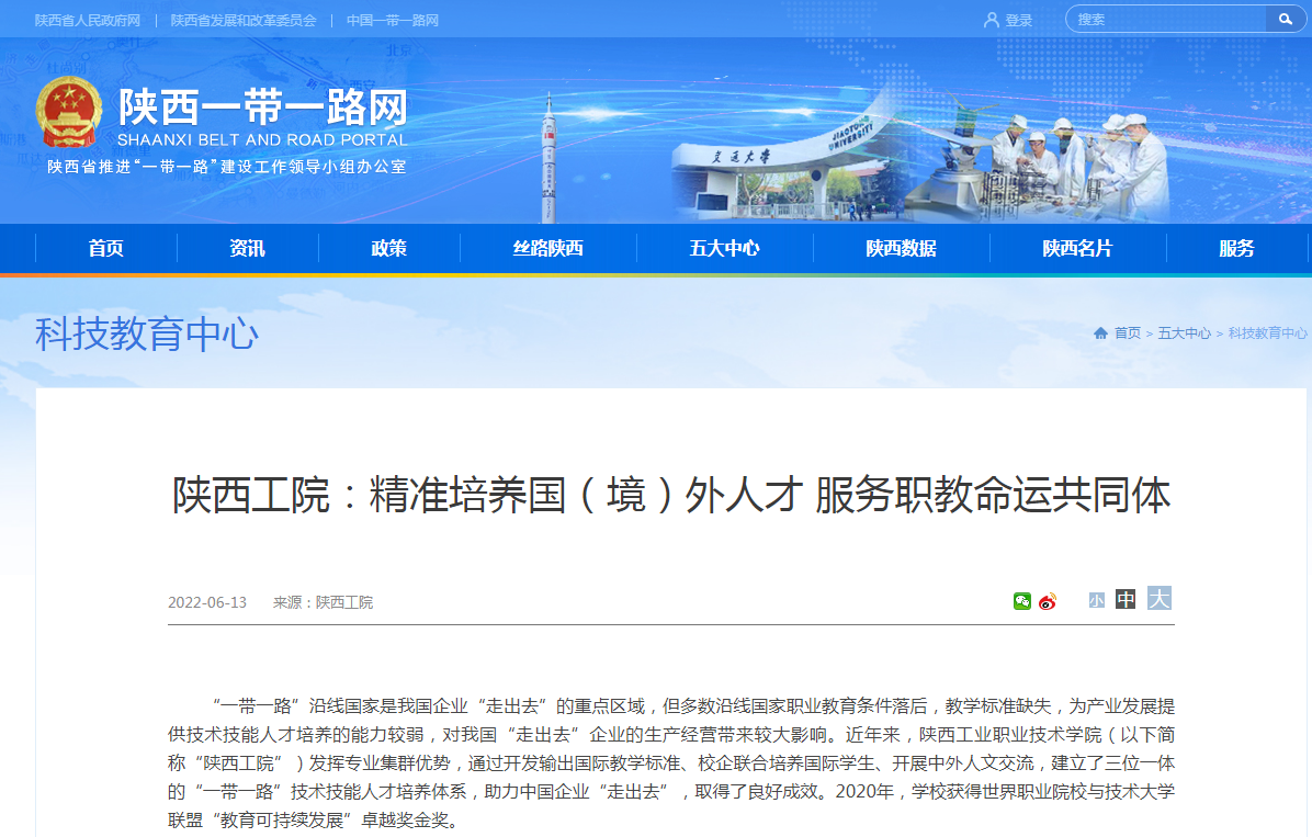 “一带一路”沿线国家是我国企业“走出去”的重点区域,但多数沿线国家职业教育条件落后,教学标准缺失,为产业发展提供技术技能人才培养的能力较弱,对我国“走出去”企业的生产经营带来较大影响。近年来,威尼斯7798cc(以下简称“陕西工院”)发挥专业集群优势,通过开发输出国际教学标准、校企联合培养国际学生、开展中外人文交流,建立了“三位一体”的“一带一路”技术技能人才培养体系,助力中国企业“走出去”,取得了良好成效。2020年,学校获得世界职业院校与技术大学联盟“教育可持续发展”卓越奖金奖。