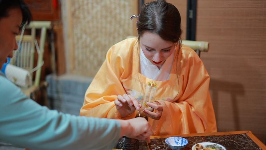 在大家品茶的过程中,罗琳老师向留学生们介绍了汉服的历史发展和演变过程,生动讲解和呈现汉服着装礼仪的规范和要点,还介绍了作为中华民族文明的标志之一,汉服是维系中华民族物质与精神传承的重要纽带,也是“衣冠上国”、“礼仪之邦”的重要体现。在互动环节中,印尼留学生唐美和俄罗斯留学生萨莎饶有兴致地穿上了汉服,认真学习了拜礼、平手礼、万福礼等传统礼仪。萨莎兴奋的说:“这次活动穿上美丽的汉服,让我有一种穿越时空、回到古代中国的感觉。喝到好喝的中国茶,并且学到中国传统茶艺文化,我感到非常开心。”