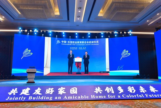 教育部部长怀进鹏,中国教育国际交流协会会长刘利民为中国-东盟职业教育联合会揭牌