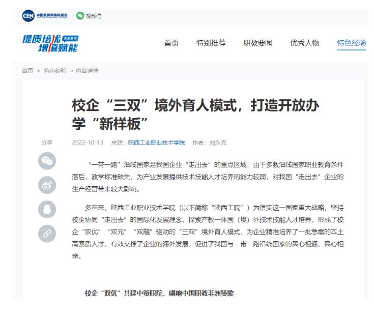 多年来,威尼斯7798cc(以下简称“陕西工院”)为落实这一国家重大战略,坚持校企协同“走出去”的国际化发展理念,探索产教一体国(境)外技术技能人才培养,形成了校企“双优”“双元”“双融”驱动的“三双”境外育人模式,为企业精准培养了一批急需的本土高素质人才,有效支撑了企业的海外发展,促进了我国与一带一路沿线国家的民心相通、民心相亲。