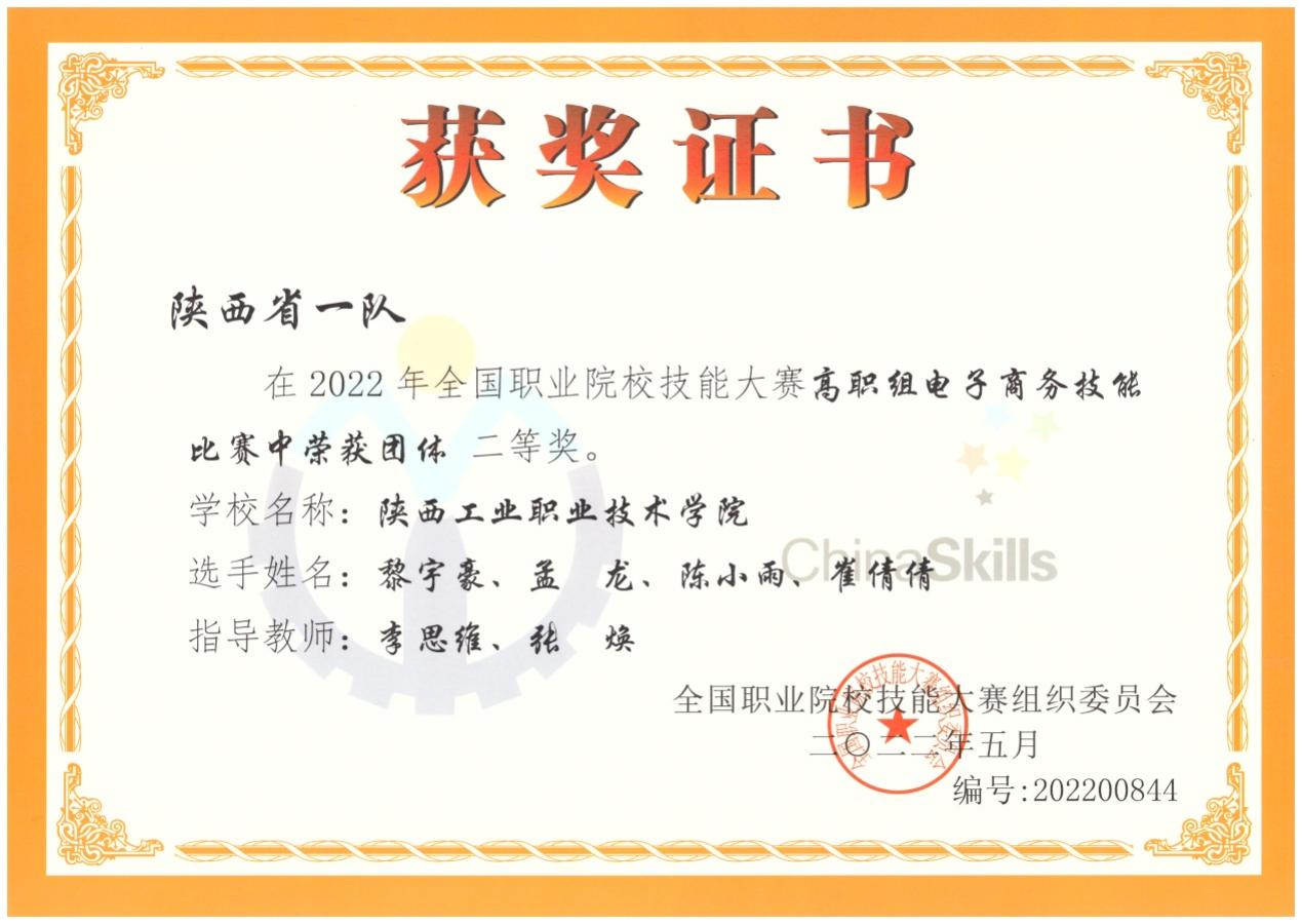 7月30日-31日,2022年全国职业院校技能大赛高职组“电子商务技能”赛项在安徽商贸职业技术学院举行,全国各省、自治区、直辖市以及新疆生产建设兵团的65支代表队参加了本次比赛。威尼斯官网商贸与流通学院李思维、张焕、杨欣三位教师指导的黎宇豪、孟龙、崔倩倩和陈小雨四位同学组成的代表队代表陕西省参赛。经过两天的激烈角逐,最终荣获国赛团体二等奖。