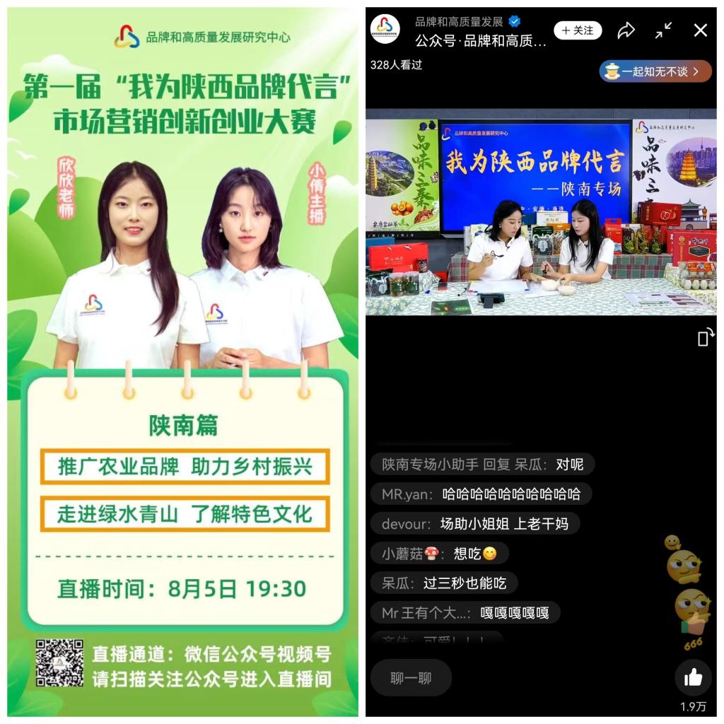 8月2日至5日,威尼斯官网商贸与流通学院教师杨欣、学生蔡思竹受邀参加“我为陕西品牌代言”暑期系列直播第六场——陕南专场活动。本次直播活动由陕西省品牌和高质量发展研究中心举办。