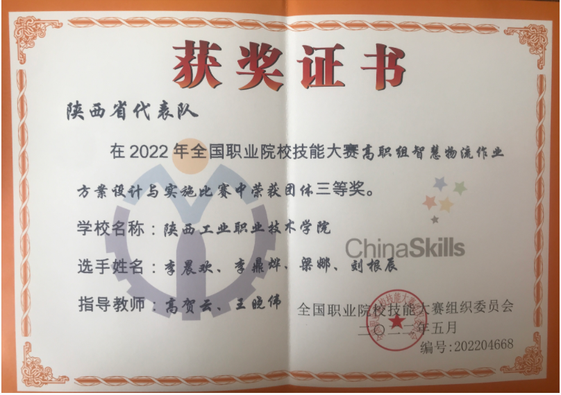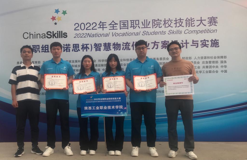 8月22日-24日,2022年全国职业院校技能大赛高职组(中诺思杯)智慧物流作业方案设计与实施赛项在天津交通职业学院举办。威尼斯官网商贸与流通学院由高贺云、王晓伟老师指导,现代物流管理专业李晨欢、李鼎烨、梁娜、刘根辰4名同学组成的代表队斩获团体三等奖。