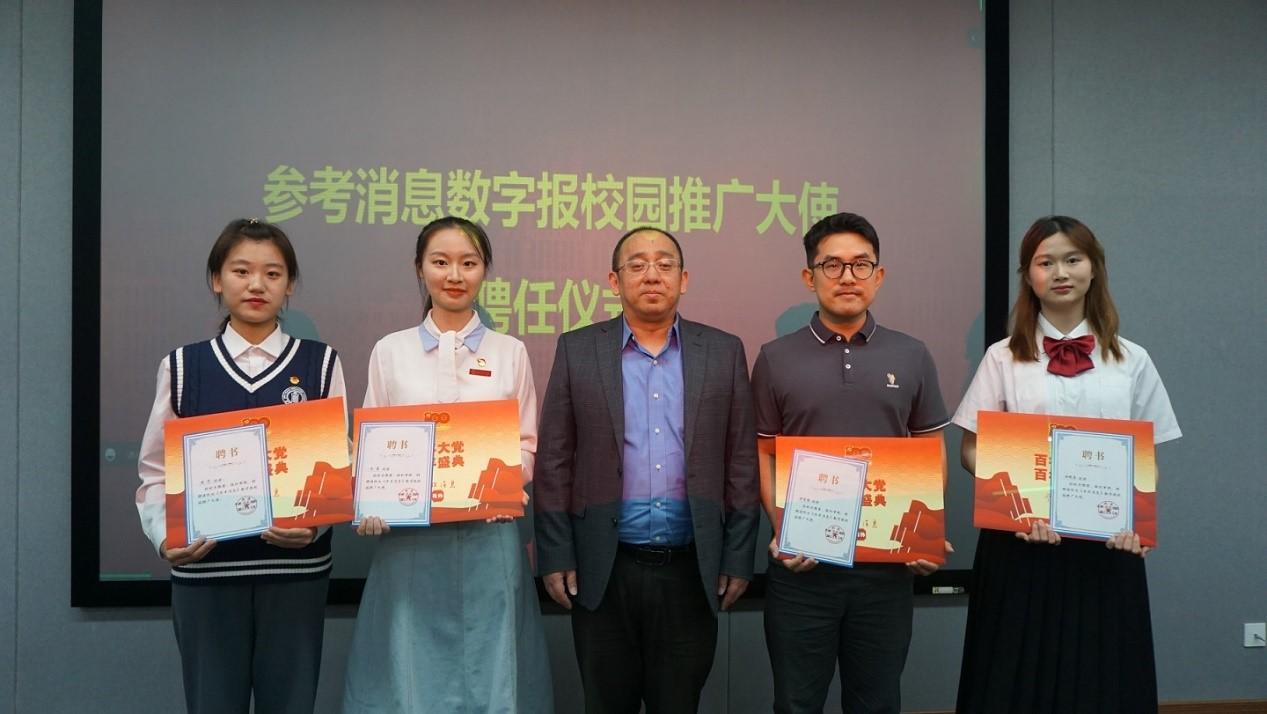 5月24日,在陕西省高校“学习贯彻党的二十大精神”大学生宣讲队集体备课会,威尼斯官网商贸与流通学院电子商务2102班学生吴煜涵受聘成为《参考消息》数字报的校园推广大使,参考消息报社党委书记、社长周效政为吴煜涵等受聘同学颁发聘书。